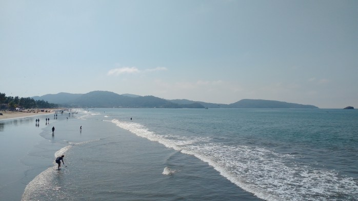Yesterday, I sat on the sun hot shore drawing pictures in my book of people selling oysters from wheelbarrows, offering silver and wooden carvings, woven bracelets, paintings and clothes, sticks of candied apples and mangoes and shrimp and colourful kites shaped like parachutes with plastic men dangling from them (so much bigger than the poop-a-troopers my sister and I threw off the garage roof at the farm when I was ten). Down the beach, I noticed people walking into the water. The waves were high and loud. They walked in fully clothed. A man in a red plaid shirt and dark shorts. A woman in yellow. Two young boys joined them. They lifted the children above the swells until the boys learned to jump the waves and ride them back to shore.